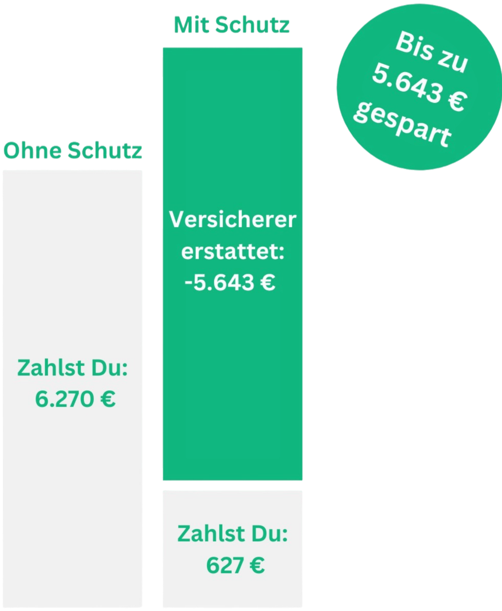 Zusammen ergeben diese Behandlungen Gesamtkosten von 6.270 €. abzüglich einer Erstattung der Zahnzusatzversicherung von 5.643 € ergibt sich ein verbleibender Eigenanteil von nur 627 €. Mit einem monatlichen Beitrag von lediglich 30 € entstehen dir maximal Kosten in Höhe von 3.600 €. Somit kannst du bei einer Erstattung von 5.643 € rund 2.000 € einsparen.